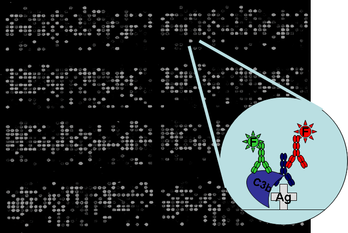 Serum antibodies and complement proteins bound to the antigen array are detected by secondary antibodies Result: quantity and quality of antigen specific antibodies in serum